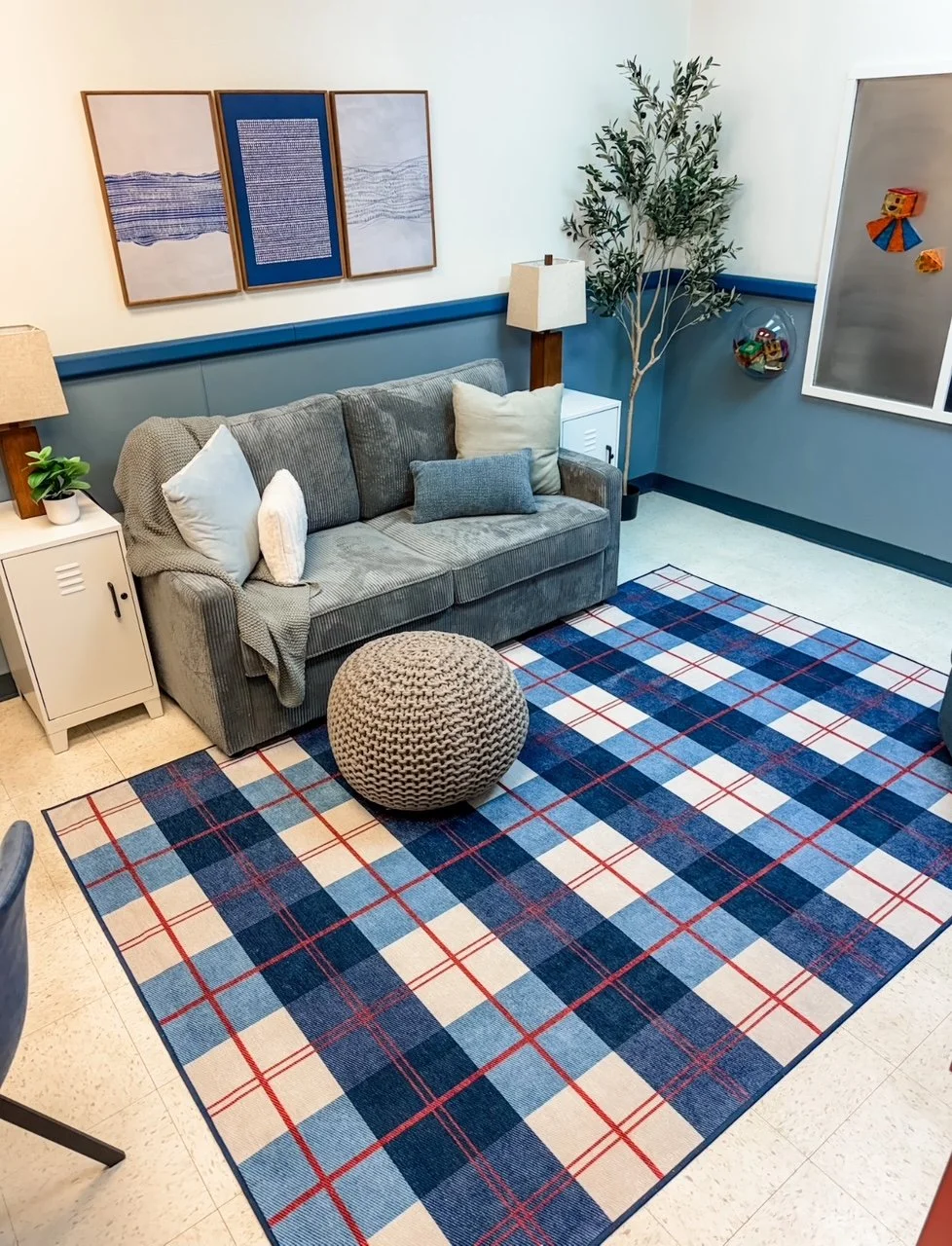 The office had two rooms that were very similar to each other. We made one the Lily Pad and the other a freshened up visitation room. Our team arrived and the top part of the walls were given a fresh coat of paint and the floors were cleaned. After that the activity wall was installed (always a hit!) and all the furniture was assembled. It all came together nicely and now the kids in Aiken County have a playful, colorful, child-centered space to spend their time while in the office awaiting their next steps.