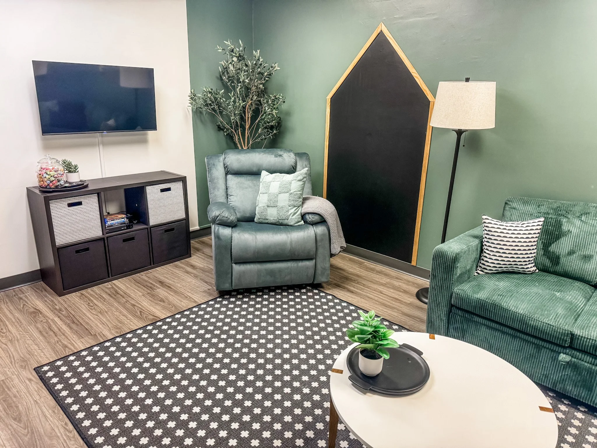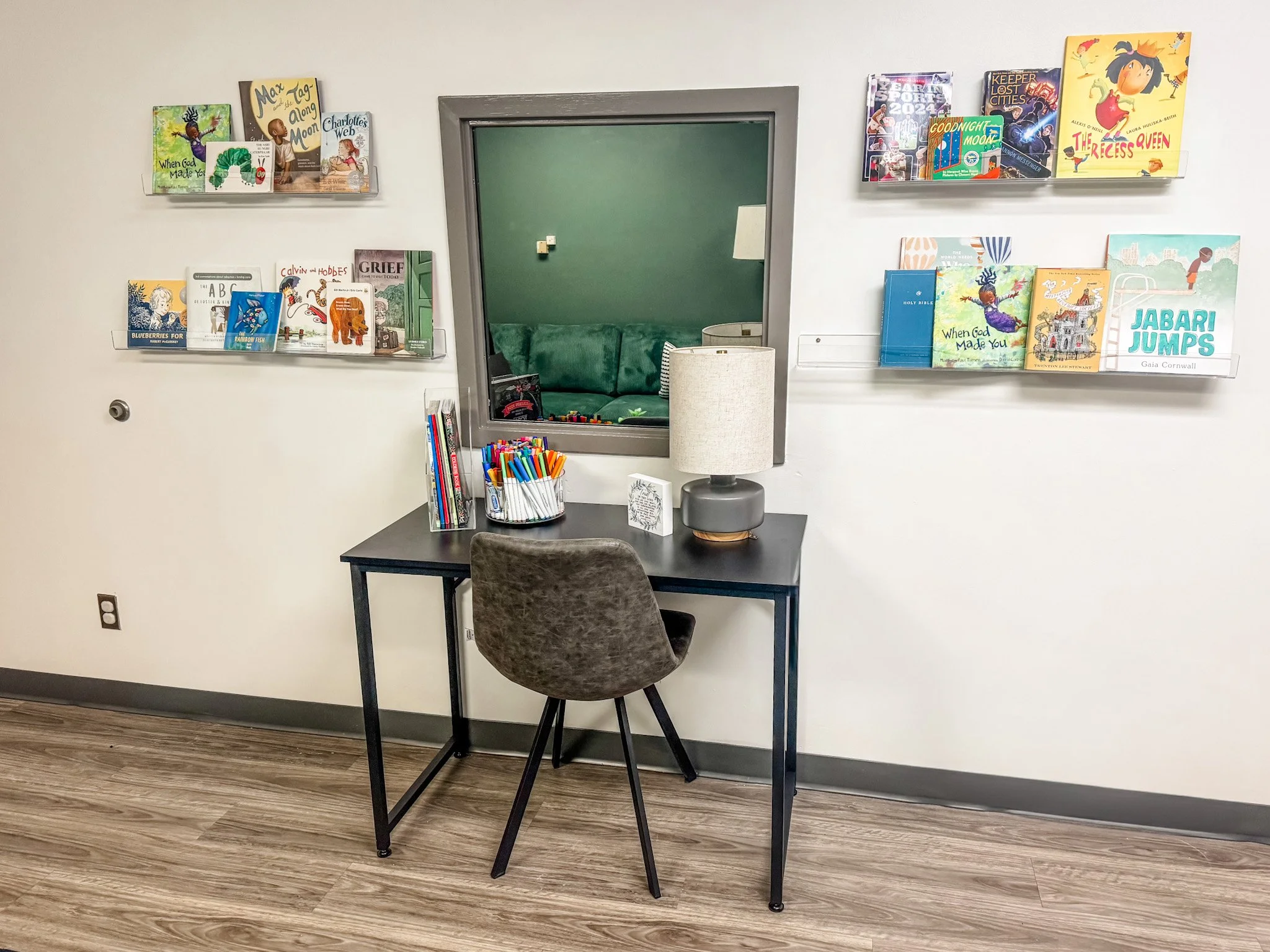 With a sectional and an extra rollaway bed there is plenty of sleep space. In addition to all of the standard Lily Pad items: books, sensory toys, weighted blankets, TVs with a Nintendo Switch and DVD player, and coloring supplies, we also refreshed a room that is used for babies and gave them an updated visitation room.